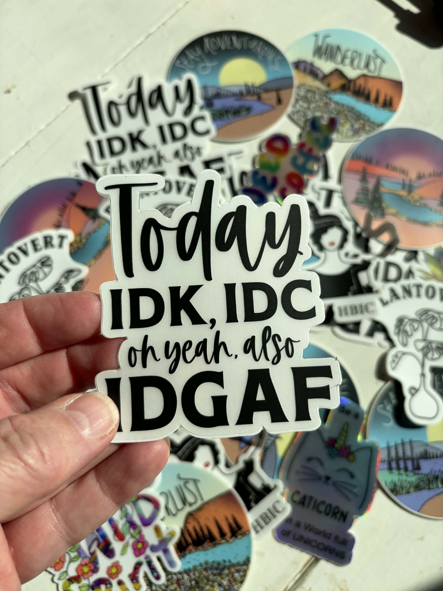 Today IDK, IDC, IDGAF Sticker Express your mood with this cheeky sticker pack featuring three relatable acronyms that say it all. Perfect for laptops, water bottles, skateboards, or anywhere you need a dose of honest humor. Weather-resistant vinyl construction keeps your vibe intact through sun, rain, and everything in between. Stick it where your attitude lives.