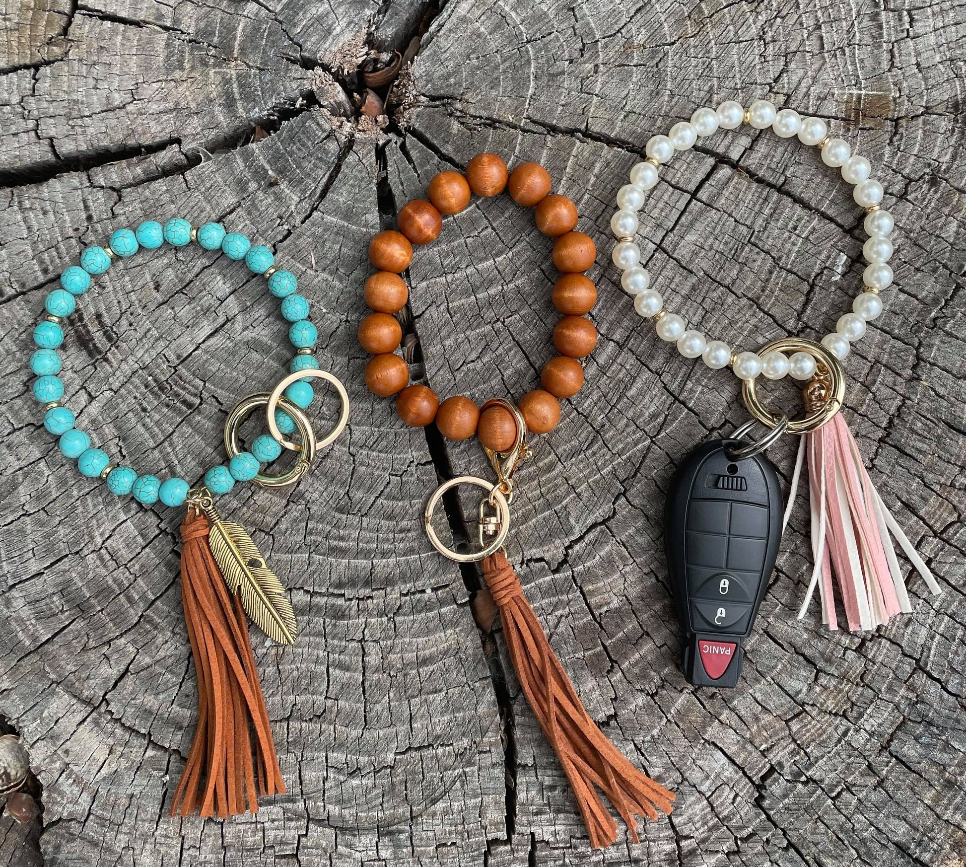 Wood Bead Bracelet Keychain | Natural Wristlet Key Holder